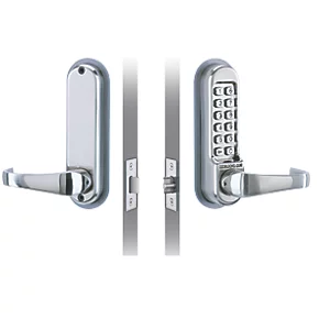 Easy to fit, heavy duty, mechanical push-button lock with heavy duty tubular latch, easy handing and code-free entry. Stainless steel PVD, weather-resistant, low maintenance finish. Suitable for use in commercial buildings, hospitals, schools, hotels and leisure, warehouses, industrial buildings and transportation.