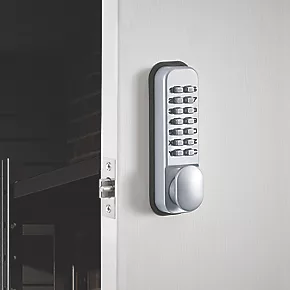 Easy to fit, medium duty, mechanical push-button lock with tubular latch and optional holdback facility. Silver finish.